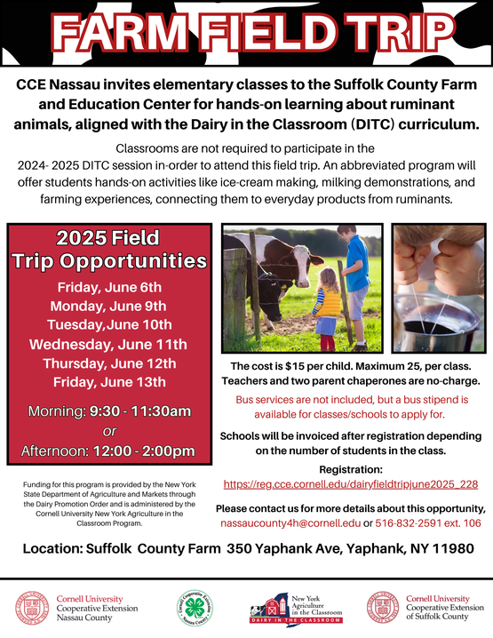 Cornell Cooperative Extension of Nassau County, in partnership with New York Agriculture in the Classroom, is excited to offer Dairy in the Classroom , a free, 6-week educational program for Nassau County elementary schools. Through engaging lessons, students will explore how milk travels from local farms to their table while discovering careers in agriculture, sustainable farming practices, and the science behind dairy foods.
