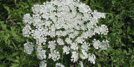 Giant Hogweed is a perennial herb with tuberous roots that survives season to season by forming perennating buds and enduring dormancy during the winter months. The plant grows numerous white flowers that form a flat, umbrella-shaped head that can reach two and a half feet across resembling Queen Anne’s Lace. Giant Hogweed produces about 100,000 seeds from the flower head in late summer which are about half an inch long and can spread through animals, surface runoff or wind. These seeds can remain viable in the soil for up to ten years. The stems of Giant Hogweed are typically three to four inches in diameter and hollow. They produce large lobed, deeply incised compounded leaves that can reach five feet in width. Giant Hogweed can grow as tall as 15 to 20 feet high.